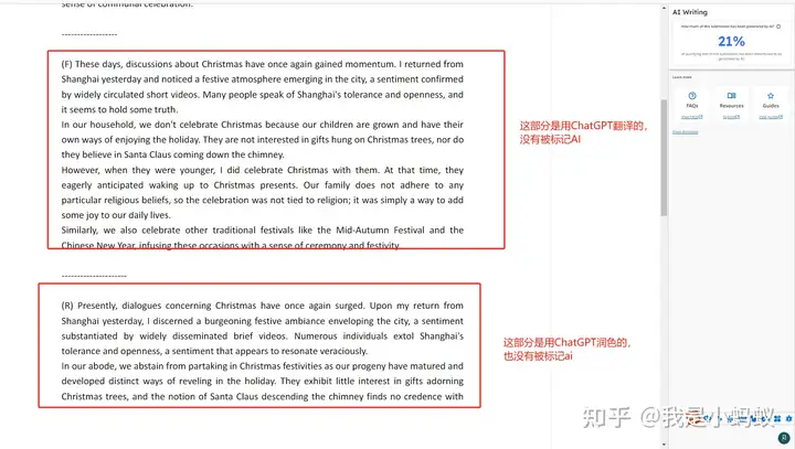 最后将ChatGPT写的,翻译的和润色的整理到一个文件里,提交turnitin测试AI结果,AI结果是21%,主要是来自于用ChatGPT写的部分。而用ChatGPT翻译和润色的部分没有被标记AI重复,如下图。