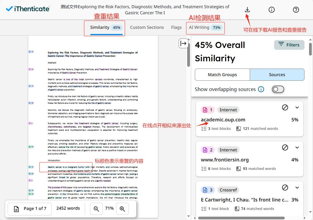 推荐使用iThenticate系统,iThenticate系统的查重+AI检测率是一同出来(如下图),还有在线报告可以查看结果。