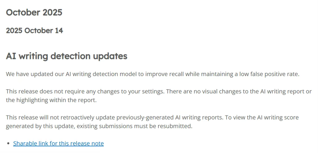 从2025年10月14号开始官网对AI检测进行了更新(下图),大大提升了AI检测的灵敏度,导致很多文章的AI检测率显著提升。虽然是自己写的,但如果写完后用了翻译工具或其他AI工具进行润色和降重(比如Deepl、ChatGPT,DeepSeek等大语言模型工具),都会使得AI率变高,这也是官网更新AI检测的灵敏度导致的。